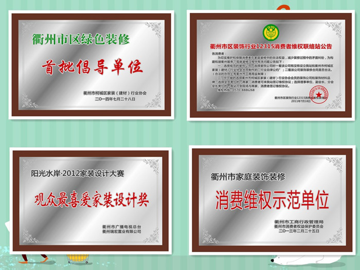 2011年被衢州市工商行政管理局評(píng)為衢州市家庭裝飾消費(fèi)維權(quán)示范單位;